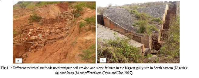Most of the slope failure in South east Nigeria mostly results from degradation of the soil due to erosion. In this regard, there are several gully sites in south east part of the Nigeria at varying stages of development (Okorafor et al. 2017). For instance, the number of gully site in the different states in South Eastern Nigeria area as follows Anambra (700), Enugu (600), Abia (300), Imo (400), and Ebonyi states (250) (Igbokwe et al. 2004; Egboka, 2004). The statistics on the gully erosion sites are not exhaustive, since new sites are being created every rainy season due to increased rainfall intensities and duration leading to flooding. According to estimates, among other environmental issues in Nigeria, slope erosion and landslides affects roughly 50 million persons and causes the largest GNP loss ($3 billion annually) (World Bank, 1990). This is one of the most existential dangers to the huge population of Southern Nigeria and certain areas of Northern Nigeria (Egboka et al., 2019). (Obaisi, 2018). These have resulted in the loss of life, agricultural land, and other priceless possessions (Egboka et al., 2019). On the other hand, a few of the indirect effects of landslides include the disruption of transportation networks, the interruption of agriculture production, reduction in the valuation of facilities in close proximity to slope failure-prone locations etc.