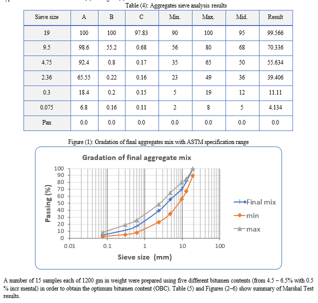 Asphalt mix requires the combining of two or more aggregates, having different gradations, to produce an aggregate blend that meets gradation specifications for a particular asphalt mix. Available aggregate materials (19), (9.5), (4.75), (2.36), (0.3), (0.075) and sand are integrated in order to get the proper gradation within the allowable limits according to ASTM specifications using mathematical trial method. This method depends on suggesting different trial proportions for aggregate materials from whole gradation. The percentage of each size of aggregates is to be computed and compared to specification limits. If the calculated gradation is within the allowable limits, no further adjustments need to be made; if not, an adjustment in the proportions must be made and the calculations repeated. The trials are continued until the percentage of each size of aggregate are within allowable limits. The percentage of aggregate type A was 60%, the percentage of aggregate type B was 20% and the percentage of aggregate type C was 20% as shown in table (4) and figure (1).