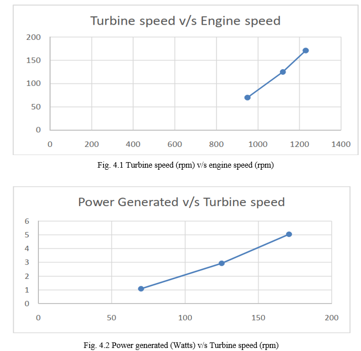 Study and performance analysis of charging vehicle battery using bike exhaust gas by K. Kumaravel, P. Bala Shanmugam, and G. Balasubramanian [2], They had done different studies according to their practical inputs. They had approached the problem with different engine RPM. Practically for different engine speeds for different turbine power output were observed.