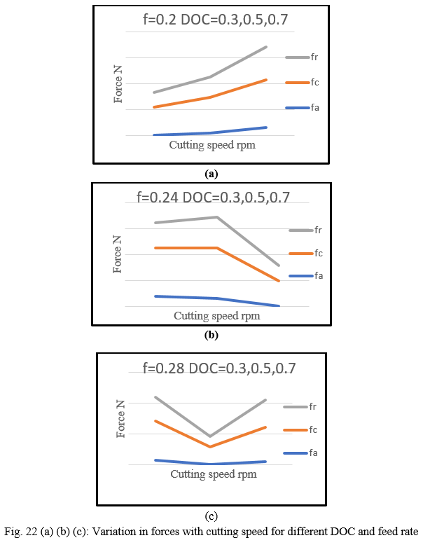 Figure illustrates that by keeping speed and depth of cut in the specified range at moderate levels, the for almost all feeds, the most efficient cut can be achieved. It may be deduced that the provided parameter range should be cut at lower to moderate speeds with medium depths of cut, utilised to accomplish energy efficient machining. In the graph shows the taken parameters cutting speed 112,180,400rpm and feed 0.2,0.24,0.28mm/rev and DOC 0.7,0.3,0.5mm. the depth of cut 0.3mm in that point the all three forces values are low. another graph cutting speed 112rmp and DOC is 0.3,0.5,0.7mm.Fr and Fc forces are high at feed 0.28 and DOC is 0.7. Fig. 23 (a) and (b) shown the Forces change as the feed rate and depth change.