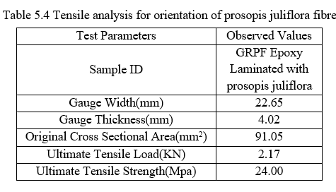 From the above graphs it is observed that, the ultimate tensile strength for GRPF epoxy laminated specimen is 271mpa of the ultimate tensile load of 34.28KN.The ultimate tensile strength for GRPF Epoxy Laminated With Orientation of Prosopis Juliflora Fibre specimen is 329mpa of the ultimate tensile load of 34.23KN.So it is concluded that the ultimate tensile strength of GRPF Epoxy Laminated With Orientation of Prosopis Juliflora Fibre specimen is higher than the GRPF epoxy laminated specimen alone.