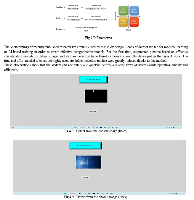In conclusion, this system enables the model to detect the cloth pattern and the defect with higher accuracy level. There are several processes in the proposed model. The fabric image captured by the image acquisition system is pre-processed to enhance the defective area using histogram equalization and grey scale conversion. Then, the fabric problem is found using image analysis. To build a reliable and computationally efficient system, a modified CNN architecture is employed for the defect detection process. The system\'s operation is halted and the nearby operator is informed if it discovers a potential flaw in the fabric roll. The operator then accepts or rejects the system evaluation and gives the go-ahead for the procedure to continue and move on to the subsequent fabric image. These observations show that the system can accurately and quickly identify a diverse array of defects while operating quickly and efficiently.