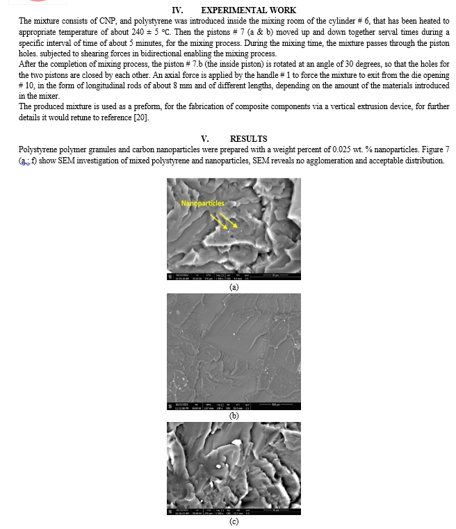 Polymer nanoparticle composites present industrial potential in many applications. However, some limitations for the application of these composites are due to the non-uniformity of their mechanical properties. One of the main issues of that drawback is the lack of uniform distribution of the nanoparticle’s reinforcement inside the polymer matrix. In other words, uniform distribution of nanoparticles throughout polymer matrices presents a crucial issue for obtaining sound parts of fair enough mechanical properties. That would present a limitation for use in different areas of applications. A mechanical mixer with a special design has been developed during the present work. A prototype mixer has been carried out, and used for the synthetization of polystyrene carbon nanoparticles, (CNP’s) composites. The design of the developed mechanical mixer is based on the principle of subjecting the mixture of CNP’s and Polymer to multi-shearing strokes in a bi-directions extrusion die during heating at appropriate temperature for a specific time. The produced composites have been subjected to metallographic examination, and mechanical testing to investigate the effectiveness of using the developed mechanical mixture. Metallographic examination of specimens of the produced composites parts using SEM have shown fair enough distribution of the carbon nanoparticles throughout the polymer matrix. The mechanical properties of the produced composites have been evaluated, and the results showed comparable values with respect to those dismantled in publications.