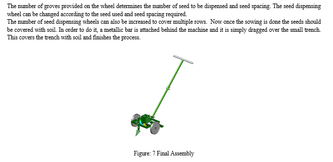 Soomro et al.(18) evaluated different sowing methods and seed rates for wheat, recommending drilling at 125 kg/ha for optimal yield and quality Adalinge et al. (19) developed a manually operated seed sowing machine for simultaneous tasks involved in seed sowing, with a simple design.