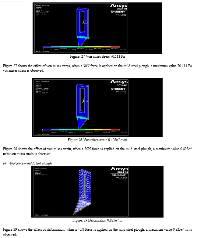 Sowing machine should be suitable to all farms, all types of corps, robust construction, also it should be reliable, and this is basic requirement of sowing machine. Manually operated seed sowing machine reduces the efforts of farmers thus increasing the efficiency of planting also reduces the problem encountered in manual planting. Manually operated seed sowing machine can plant different types and different sizes of seeds also can vary the space between two seeds while planting. This increases the planting efficiency and accuracy. The focus of this research work is to design, analysis of plough and fabricate a low-cost Manually Operated Seed Sowing Machine for effective handling of the machine by any farmer or by any untrained worker with simplified design. The components of seed sowing machine were modelled by using Auto CAD 2022. Analysis of plough was performed by using Ansys 2023-student version. The fabricated seed sowing machine perform the various simultaneous operations and saves labour requirement so as labour cost, labour time and also save lots of energy.