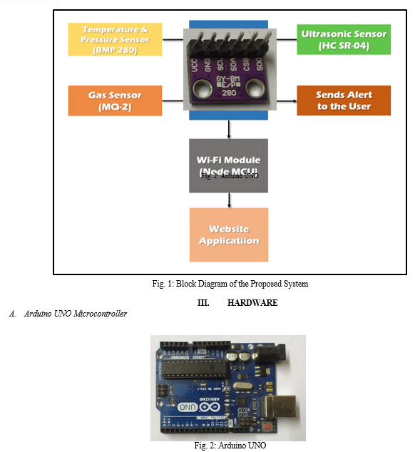 The heart or the central part of the project is the microcontroller, which is the Arduino UNO. The code has been written in the Arduino IDE. Header files has been used for establishing the Wi-Fi connection and also for the serial communication between the Arduino and Node MCU [5]. The BMP 280 Temperature and Pressure sensor collects the data through the SDA pin and the Arduino receives it through the analog pins using the analogRead() function [6]. The Ultrasonic sensor produces a PWM signal using the digitalWrite() function of the Arduino by giving a particular Time Period and uses the SONAR mechanism to calculate the distance of the obstacle. The MQ-2 Gas Sensor collects the data and uses the analog pin to send the data to Arduino. For all the parameters, individual threshold values has been defined and if any value crosses the threshold, then an alarm will be triggered to warn the admin.