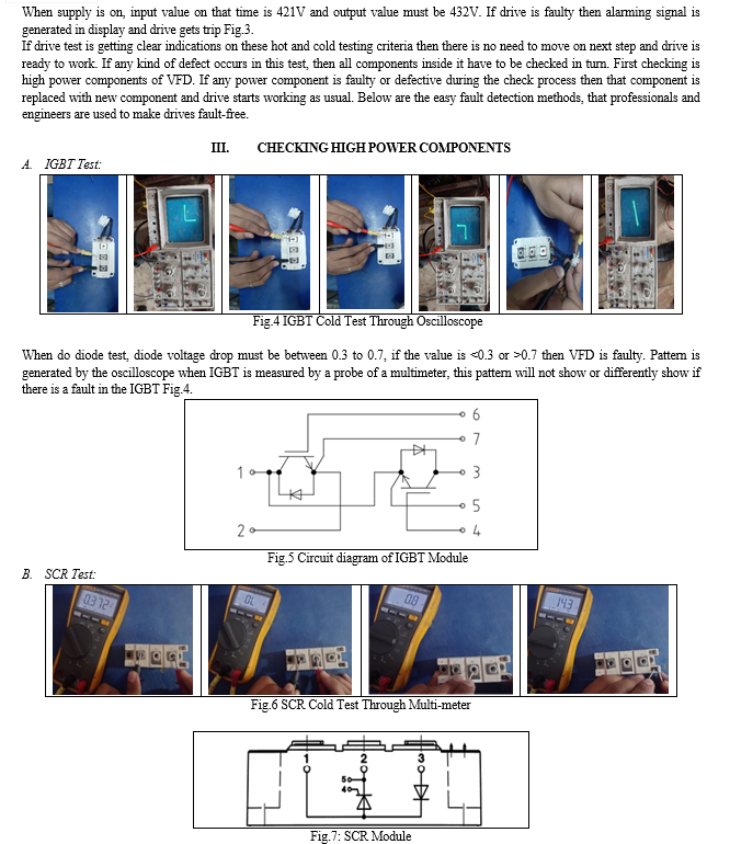 Variable Frequency Drives (VFDs) are essential instruments in modern industrial systems, providing precise control over motor speed in various industrial applications and improving energy efficiency. Faults in VFD’s can lead to costly downtime and reduced productivity. This paper presents precise fault detection technique for VFDs and its technical components providing flawless step by step method for quick access of faulty parts / items and time saving in testing methods. Experimental results demonstrate the effectiveness of the proposed approach in accurately detecting faults in IGBT, SCR, choke, capacitor, power card, control card, firing card, CT card and its causes like temperature over voltage and current, aging, atmosphere and bearing wear etc. The proposed methodology offers Cold test and hot test methods applied on common technical machines using oscilloscope and multi-meter.
