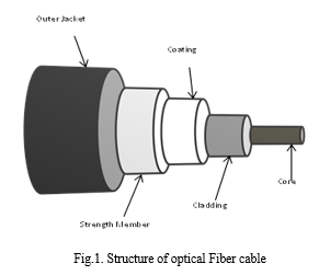 An optical fiber is a dielectric cylindrical waveguide created from low-loss materials, commonly silicon dioxide. It is made up of three centered parts namely as outer coat, core and its cladding. The core is the light-carrying portion of the fiber which is usually made of glass or plastic. Cladding surrounds the core and made of a material with a slightly lower refraction index than core. Buffer is the outer layer to protect the core and cladding from damage and it serves as a shock absorber. The coating usually comprises one or more coats of a plastic material to protect the fiber from the physical environment. In some of the fiber optics cable, there may be metal dressing referred as sheath which provides further physical safeguarding. This difference in the indices causes total internal reflection to occur at the core-cladding boundary along the length of the fiber. Light is transmitted down the fiber and does not escape through the sides of the fiber.