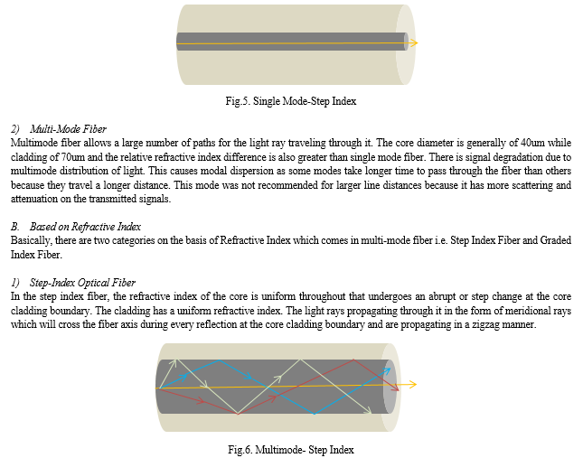 Based on number of propagation modes:, Where mode is concept to delineate fiber optics propagation nature for electromagnetic waves inside a waveguide. Mode means the nature of the electromagnetic field pattern (or) configuration along the light path inside the fiber [6]. It is classified into 2 types:
