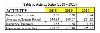 Receivable Turnover Ratio: There is an increase in the ratios of Coca-Cola company in the last three years which is positive for the company (Table 5). As compared to the first two consecutive years, the ratio improved in the year 2020 (Table 5). In 2018 and 2019 the company was able to collect its credit sales 2.5 times approximately a year, whereas in 2020 the ratio almost touched 3 times recovery in a year (Table 5). This indicates that the company is efficient in collection of its average receivables (My Accounting Course, 2021). As the company can collect cash from customers sooner, it will be able to use that cash to pay bills and other obligations in time (My Accounting Course, 2021).