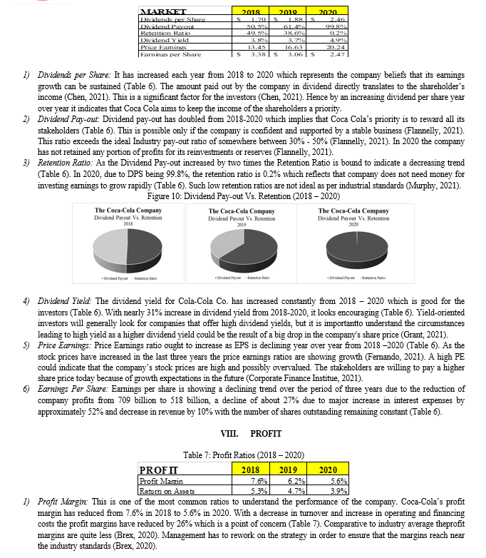 The company has not ploughed back its profits in the year 2020 which seems that the shareholders were their priority. This is not a general market practice. Coca-Cola should have retained a certain percentage of its profits forfuture growth and investment opportunities. Also, with interest liabilities that have increased by 50% in 2020, it is better for the company to retain the profits and pay off its debt obligations to reduce the finance cost and increase the margins helping in overall increase in the profits of the company.