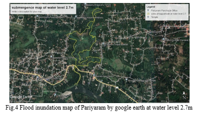 4. Annamanada Panchayat: From the surveys and analysis, it is clear that left bank of Cheruvaloor and upstream side of Pulikakadavu bridge was the initially drowned area. Area inundated when river gauge reading reached 4.26 m at arangaly station and the corresponding inundation height was 0.1 m. Table 8 explains river gauge readings and corresponding inundation heights at vettilappara and arangaly station. Fig.5 shows inundation map of Kadukutty and Annamanada panchayats.