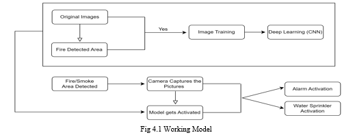 Fire can be identified by utilizing how much smoke. The smoke sensors are utilized to gauge how much smoke from the fire, and it very well may be contrasted and an edge esteem and assuming it is past that worth, it is considered as a fire scenario.Using picture handling, fire can be distinguished straightaway. Fixing the CCTV camera all over and the pictures from these cameras can be handled to screen the fire. In the event that any progressions happen, it is not difficult to rapidly identify and douse the fire. This framework has a water dowser to smother the fire when the caution turns on. The CCTV camera is utilized for recording the video of a specific spot and it is associated with a smaller than expected PC called Raspberry-pi. So it could get the steady video recording of a specific region. The caught video pictures are handled edge by outline and when the fire is identified, the alert would be turned on. Likewise, the alert would be switched off when the fire stifled completely.The Virtual Organization Registering is utilized for the execution of the program, where the subtleties of video are moved from the raspberry-pi to the survey computer.This framework incorporates discovery, alert, fire smother, programming and organization modules. The calculation is delicate to enormous woodland regions and the location of fire in less probabilistic fire-inclined regions is awful. A Quicker R-CNN has been proposed to identify wood fires. To settle the equivocalness in preparing information non-genuine smoke pictures were delivered by setting up genuine or simulative smoke into the woods foundation. Be that as it may, this location calculation is more inclined to simulative wood smoke, and subsequently it requires further upgrades in supporting the exhibition with constant fire recognition. Out of control fire's smoke recognition strategy has been created to give a quick, cheap, and dependable framework for checking fire-delicate regions.