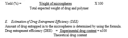 The prepared microspheres were collected and weighed. The measured weight was divided by the total amount of all non- volatile components which were used for the preparation of the microspheres. The yield percentage was determined with the following formula of Patel et al. (2009):