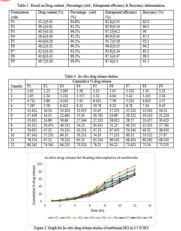 Floating microspheres containing Metformin HCL were prepared by solvent evaporation method using Ethyl cellulose and Carbopol 940. Briefly drug and polymer were mixed in the mixture of dichloromethane and ethanol in 1:1 ratio. The slurry was slowly introduced into the 100ml water containing 0.02% tween 80 while being stirring at 500rpm by a magnetic stirrer for 2 hr. at 400C to allow solvent to evaporate completely. Microspheres were washed with petroleum ether. The collected microspheres were dried at room temperature for 24 hr.