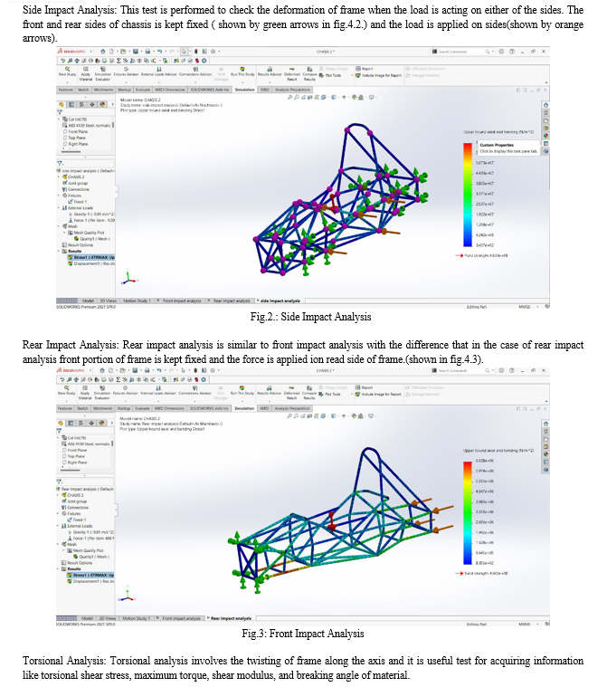 The CAD model of chassis were analyzed by using cad software(solidworks). All possible views were analyzed and Torsional stress analysis, torsional deflection analysis, torsional analysis boundary conditions, etc. were analyzed.