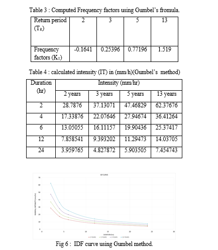 5) The results obtained from the current study on precipitation data of Kamthi Khairi indicate that there is no significant difference in rainfall analysis results of IDF curves between the applied methods. This can be attributed to the sub-tropical climate and flat terrain dominant in Nagpur, which cause only slight differences in rainfall values.