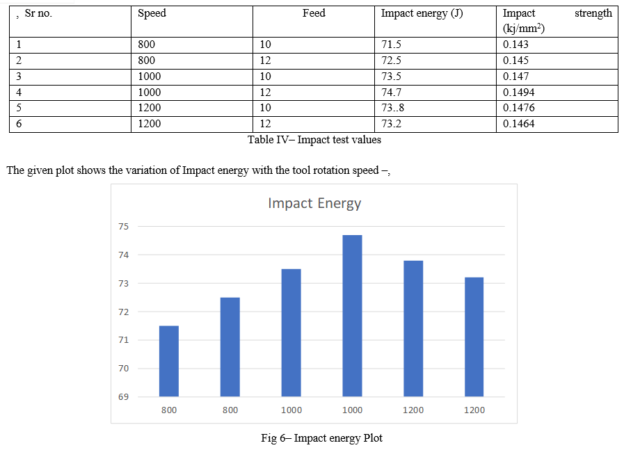 2. Impact Test: Impact Charpy test was performed at the room temperature using pendulum type impact testing machine. The values of the energy absorbed in the fracture were noted and that absorbed energy is termed as impact toughness of the material. The impact test carried out at three different rpms and two different feed speeds. The work specimens were placed with weld joint at the centre line. The impact strength first increased with increase in the tool rotational speed due to proper mixing of material to form joints but with more increase in tool rotation speed the impact strength starts decreasing due to high heat which forms the coarse grain structure. The specimens do not split into two parts during the impact test which is due to the high ductility of the joint. [5] The specifications of the impact testing machine are as follows –