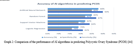 Through the analysis of intricate relationships between hormonal levels, lifestyle factors, and genetic predispositions, machine learning algorithms have the potential to detect patterns and correlations that could suggest hormonal imbalances linked to PCOS. The algorithms have the ability to identify subtle changes in hormonal profiles that may not be easily noticeable using conventional diagnostic methods. This allows for the possibility of detecting and intervening at an earlier stage [25]. As an illustration, machine learning models have the ability to detect patterns of heightened testosterone levels along with certain lifestyle factors or genetic variations. These patterns could potentially indicate a higher likelihood of developing PCOS [26]. By identifying these patterns at an early stage, healthcare professionals can implement specific prevention strategies, such as lifestyle changes or medication, to reduce the risk of PCOS development and its related complications [28]. The application of AI and machine learning in PCOS prevention shows great potential in enhancing the early detection and personalized management of this intricate disorder. Through the utilization of data analysis and pattern recognition, AI-driven approaches offer valuable insights into the complex nature of PCOS. This empowers healthcare providers to create personalized prevention strategies that are more effective.