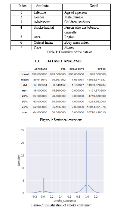 The dataset used to estimate health insurance prices often includes data about insured people, such as their medical history, lifestyle choices, and numerous demographic characteristics, in addition to the associated health insurance expenses[2]. Here's a thorough explanation of the characteristics of such datasets that are frequently present: