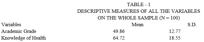 Only the 12th class students numbering 100 (50 boys and 50 girls) were randomly selected as subjects for the study. It was emphasized that they should tick þ the response after careful reading of the question; and avoid over writing. Each correct response carried two scores. The results of the subjects at their Senior Certificate Examination conducted by West Bengal Board of Higher Secondary Education were being obtained and converted into percentage, rounded off to the nearest whole number for comparing with the scores as obtained from knowledge on Health test. The ‘mean’ and the ‘standard deviation’ of all the scores obtained by the subjects were worked out. Descriptive analysis was used to find out the variability or spread of scores.