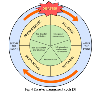 Erdelj et al [3] discusses the role of Wireless Sensor Networks (WSN) and Unmanned Aerial Vehicles (UAV) in natural disaster management. The authors classify the main applications of WSN and UAV systems according to the disaster management phase and provide a review of relevant research activities. Fig. 4 shows the disaster management cycle as depicted in the paper. They also present the challenges that remain unsolved in disaster management systems.