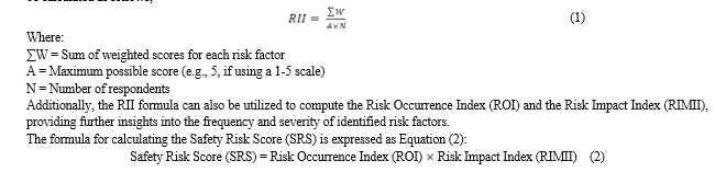 Data collection is facilitated through an online platform, specifically Google Forms, offering convenience, accessibility, and real-time data collection. The Likert scale is utilized to gather ratings on the importance, occurrence, and impact of risks. Reliability analysis, ranking of risk factors based on the Relative Importance Index (RII), and analysis of Safety Risk Score are conducted to assess the internal consistency of the questionnaire and prioritize risk factors based on their significance and potential impact. These analytical approaches enable stakeholders to focus their risk management efforts effectively and enhance project outcomes. RII can be calculated as follows;