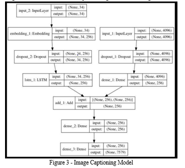 The model's final phase combines the input from the Image extractor and Sequence Processor phases using an additional operation before feeding it to a 256 neuron layer and finally to a final output Dense layer. This produces a softmax prediction of the next word in the caption over the entire vocabulary, which was formed from the text data that was processed in the Sequence Processor phase. Figure 3 depicts the network's organisational structure for comprehending the text and image flow.