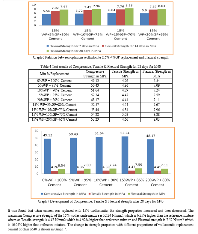 An experimental study was conducted by mixing M40 quality concrete. Preparation of concrete mix for M40 grade concrete as per IS: 10262-2019. Four mixtures were prepared in which 5%, 10%, 15% and 20% wollastonite was added to the cement, respectively. It was determined that maximum strength was achieved by replacing the concrete by 15%. For this reason, the replacement of cement with 15% wollastonite was kept constant and the samples were tested by replacing the cement with additional minerals (such as 5%, 10%, 15% & 20% of glass powder). A water/cement ratio of 0.36 was used for all mixtures throughout the study. The Compressive Strength, Split Tensile Strength & Flexural strength results of M40 grade concrete after 7th, 14th and 28th days curing are tested in the laboratory. The results are tabulated and graphs are represented below.