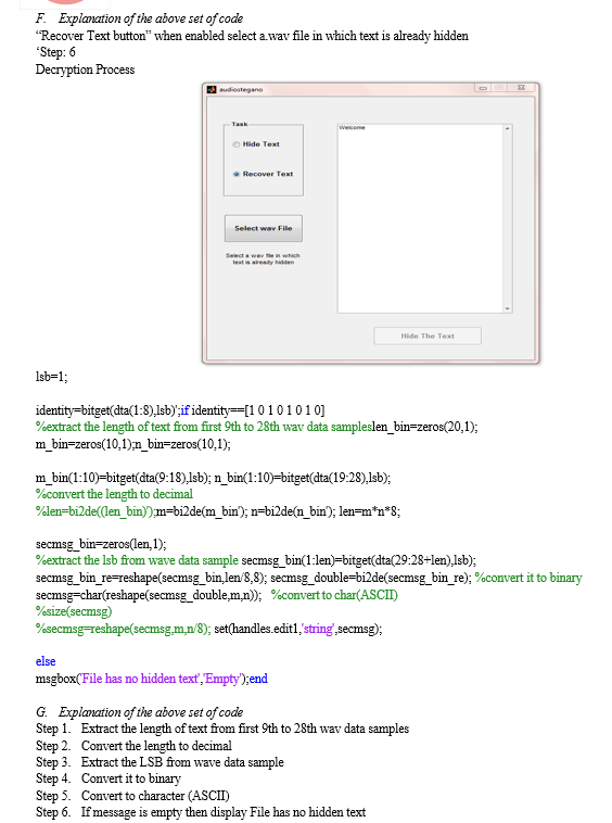Take the 46th bit as a starting point, examine the least important bit, and then queue it up. Verify each alternative sample to get all of the messages. similar to 48th, 50th, 52nd, and so forth. Alternate samples' least significant bits are stored in the queue with the previous bit's value shifted to the left. To get the ASCII from which the text can be extracted, convert the binary numbers to decimal. The following table provides a more detailed representation of the entire retrieval procedure.