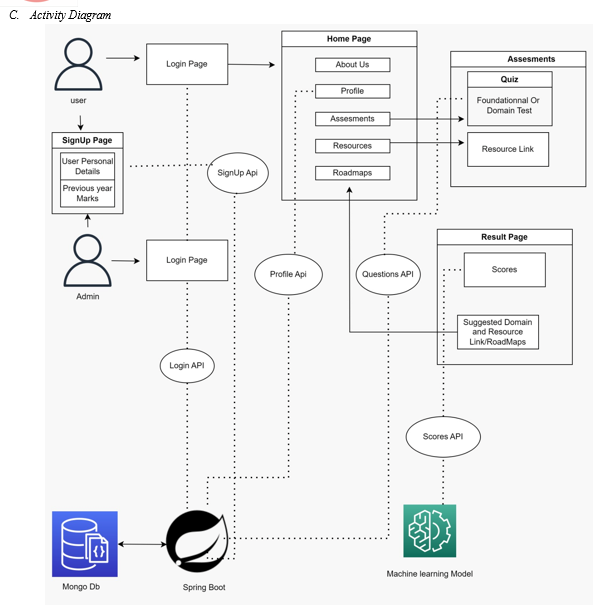 The website will offer a foundational aptitude test where students will login and start the test, this test tests the knowledge of the students and calculate scores for following basic subjects that are required for various fields in computer science: mathematics, operating systems, computer architecture, programming concepts, software engineering, computer networks, algorithms. Based on the scores of these subjects, the candidate will then be suggested with a suitable field.