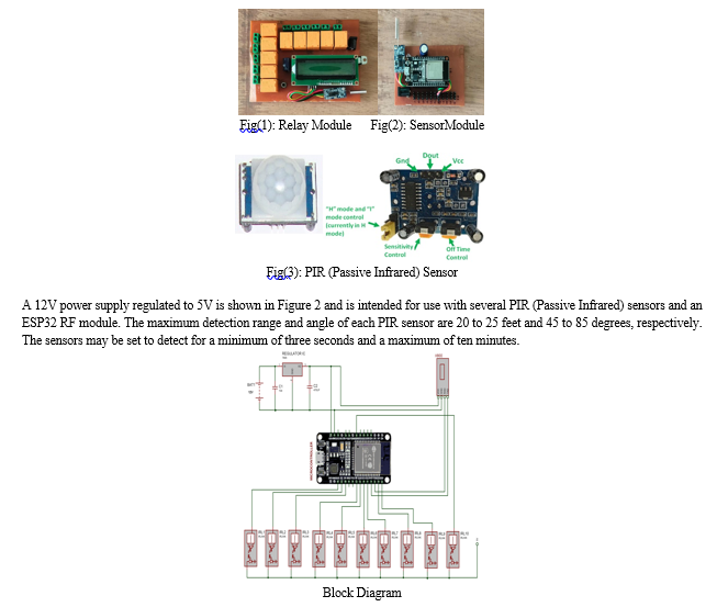 The PIR sensor, the relay, and the LED make up the circuit for the suggested setup. The regulator IC in Figure 1 changes a 12V DC input into a 5V output. The micro-controller, LCD, and RF module are all powered by the regulator IC's 5V output. Ten SPDT relays are under the driver IC's efficient control for switching. A microcontroller's limited current and possible voltage needs usually prevent it from directly operating a relay with just a 5V signal. In order to appropriately energize the relay, the driver IC receives a 5V signal from the micro-controller and converts it to a 12V signal. When coupled to a 16MHz crystal oscillator, the ATmega328 micro-controller facilitates interface with a driver integrated circuit. Electronic systems can have automatic power on/off capabilities by integrating resistors, capacitors, and a 16-character LCD into a circuit.