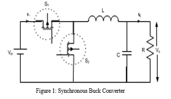 As shown in figure, the basic circuit diagram of a synchronous buck converter. The two switches S1 and S2 in Synchronous converter are operated such that there is no overlap that is during the ON time of one switch the other one will be OFF. This introduction of second switch in place of a diode, decreases the voltage drop from about 1V to about 0.3V [2]. In addition, this enhances the efficiency of the converter considerably [2].