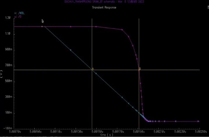 In this iteration, we simulated an 8T SRAM cell layout with a power supply voltage of 1.8 V. The results of the simulation were determined by the following parameters in Table 2, Fig 4,5,6.