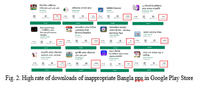 Fig. 2 shows the number of downloads of some inappropriate Bangla Apps in Google Play Stores. There are 500000+,100000+ downloads of these apps. The numbers are huge. The users are responsible to some extent for the increasing rate of the inappropriate apps in Google Play Store.