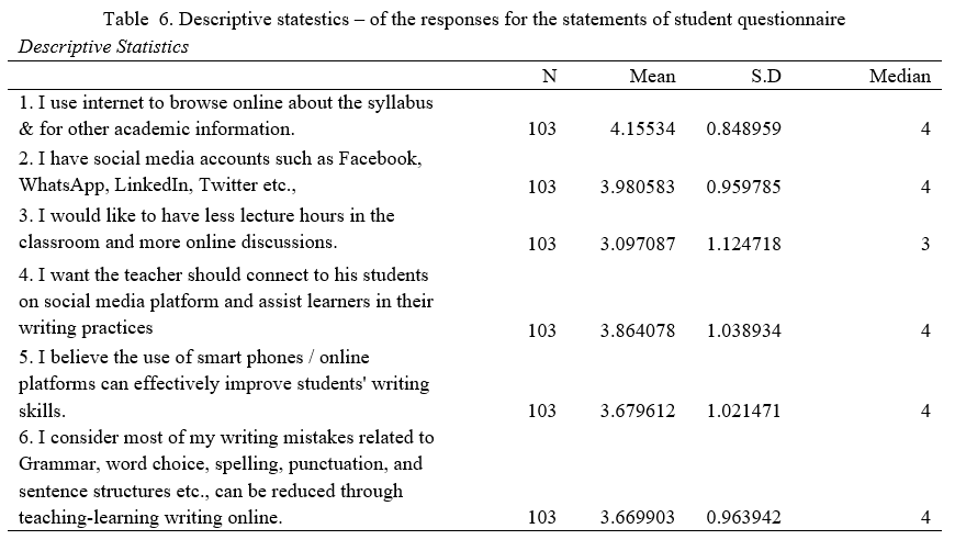The survey data collected through Google form to identify the attitudes of the students towards the use of remote online teaching-learning platforms and their expected intuition on their learning outcomes is analyzed by following the descriptive statistics. There were 103 responses from the students of various kinds of institutions such as Technical, non-technical, Govt., and self-financing colleges collected through an online Google form survey questionnaire. The questionnaire includes a few statements related to the personal details such as name, age, gender, institution in which they study, and email id. The ordinal data was collected through a questionnaire prepared by following a five point Likert scale and aimed at the six crucial statements which were focused on identifying the attitudes towards the effectiveness of the use of remote online teaching-learning platforms in developing students’ writing performances.
