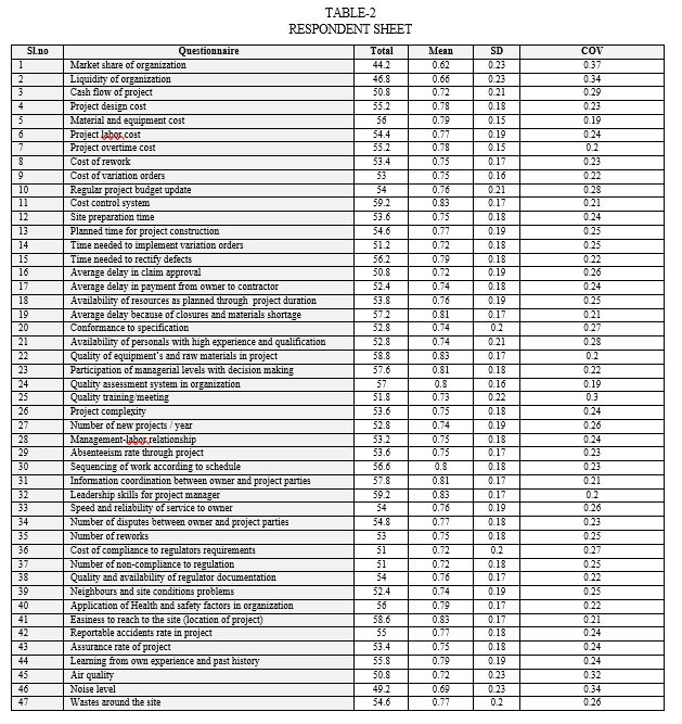 The questionnaire was designed based on critical factors were identified that contributed to the construction projects as. A questionnaire survey was developed to assess the perceptions of various construction professionals of the relative importance of causes and the effects of construction projects. The questionnaire was designed into two sections: Section A; section B. Section A is to obtain the requested background information about the respondents. Section B is to obtain information on the factors that contribute to the causes of factors in construction projects from the perspective of construction professionals. Total forty seven resources related factors were identified under eight broad categories. A five point Likert scale (1 very low, 2 low, 3 medium , 4 high , 5 very high) was adopted where respondents were asked to rank the importance and impact of a particular factor on risks in one of their selected projects.(Appendix 1).