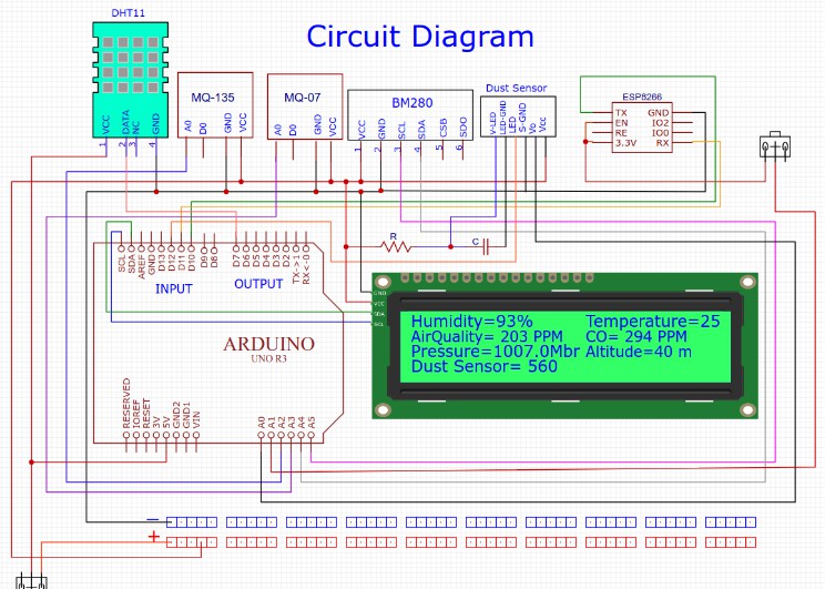 This section presents the functional description of the project, wherein the entire system is subdivided into multiple functional blocks. A detailed explanation of each block is provided for clarity. Block and circuit diagrams will be discussed in the subsequent chapter. The project’s architecture integrates an Arduino microcontroller, various sensors such as DHT11 (temperature and humidity sensor), dust sensor, and gas sensors (MQ2, MQ7, MQ135), along with an LCD display and Wi-Fi module. The primary role of the microcontroller is to gather sensor data and assess air quality. Each block is elaborated upon as follows.