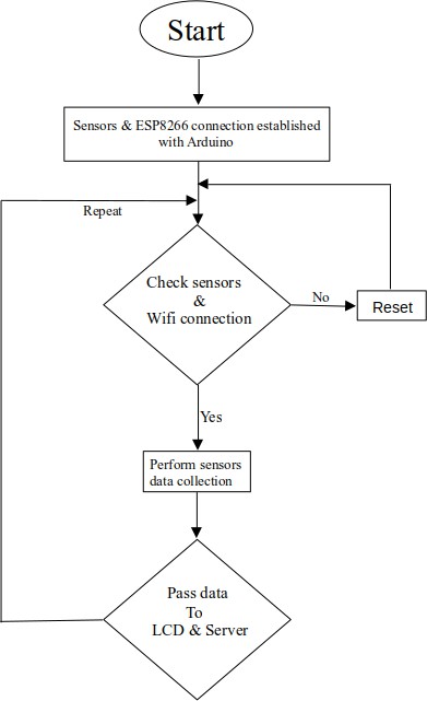 The design of the system is based on a multi-layered architecture, with the sensors forming the data collection layer, the Arduino and ESP8266 comprising the data processing and communication layer, and the server and mobile application forming the data access and user interface layer. The system’s architecture, design, and operational flow are depicted in Figures 1, 2, and 3. These diagrams illustrate how the sensors are integrated with the Arduino, how data flows from the sensors to the server, and how the mobile app retrieves and displays the information to users in real time.
