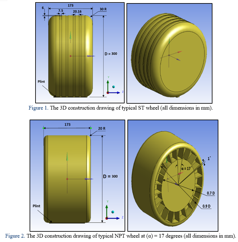 A similar ST wheel CAD model is utilized with a sidewall modification, where 20 evenly spaced spokes were added to meet the typical airless tyre shape, as shown in Figure 2 . Further adjustment to the rounded side profile since standard NPT wheels customarily have a smaller radius. Figure 2 also shows the detailed dimensions of NPT wheel geometry. Since rims are intensively interacting with the flow field near wheel sides, the rim detail kept eliminated as in the ST wheel model. Rim is redeemed by a flattened cover to allow individually investigating the effect of the NPT spokes. The longitudinal wheel grooves are omitted to simplify the NPT model.