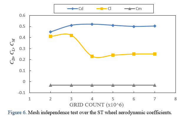 Where, τw is the applied shear stress at a specific point over the wheel surface and v is the air kinematic viscosity. Figure 5 shows the obtained Y+ values over the entire ST wheel surface, which have ranged between 25 to 350. Furthermore, a grid sensitivity study is implemented on the total grid count. The optimal grid count is received when sufficient stability levels in the aerodynamic coefficients are detected. Six different grid counts are examined, and as shown in Figure 6, the optimal grid count is around 6 million grids which are generalized for all modelled cases.