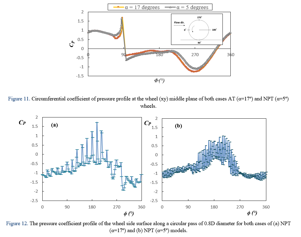 This section presents a parametric study investigating the influences of minimizing the NPT wheel’s spokes spacing angle (α) on the wheel aerodynamic performance. Five spokes’ angles are examined starting from the typical model of α=17º and proceeding by minimizing (α) to 14º, 11º,8º,5º. For a sensible variance, a straight comparison is argued between the two extreme spokes angles, 17º and 5º, for circumferential and side pressure profile, respectively. Figure 11 shows that the circumferential pressure profile of the 5º model has marginal deviations from that of 17°, which individually cause insignificance changes to the aerodynamic coefficients.
