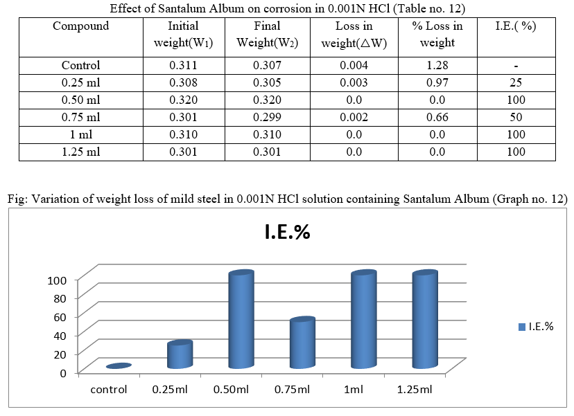 Experimental results regarding inhibition efficiency of Natural plants were Bahunia Varigata (Aapta), Azadirachta Indica (Neem), Pongamia Pinnata (Karanj), Santalum Album (Sandal Wood) and Astonia Scholaris (Saptparni). Under reveals that the natural plant leaves extract have inhibition property. They inhibit oxidation of mild steel in hydrochloric acid medium. We conclude that the inhibition efficiency is also depending on the oxidizing medium. In experimental process, we have to use hydrochloric acid medium namely 0.1, 0.01, and 0.001 N HCl concentration. Effect of natural plant leaves extract on corrosion of mild steel in hydrochloric acid medium recorded in table and represented in a graph. From the observation table we conclude that in 0.1N HCl Bahunia Varigata plant leaves extract shows inhibition efficiency 83.33 % for 1.25 ml and in 0.01 N HCl for 0.25 ml is exhibit 20.00 %. In addition, 80.00 % inhibition efficiency for addition of 1.25 ml plant leaves extract. In 0.001 N HCl acid medium at 0.50, 0.75, 1.00 ml plants leaves extract shows similarly 80.00% inhibition efficiency. In 0.1N HCl solution shows Azadirachta Indica plant leaves extract maximum inhibition efficiency 94.00 % and for 0.25, 0.50, 0.75 ml shows 80.00 % inhibition efficiency. Simultaneously in 0.01 N HCl acid medium exhibits less than 50.00 %. Interesting result in 0.001 N HCl solutions for 1.25 ml plant leaves extract is 100 % inhibition efficiency. In 0.1N HCl the inhibition efficiency of Pongamia Pinnata plant leaves, extract shows 88.46 for 1.25 ml. In 0.01 N HCl exhibits, the minimum inhibition efficiency is 33.33 % and shows 66.66 % for 0.75 ml Pongamia Pinnata leaves extract. The inhibition efficiency of Pongamia Pinnata plant leaves extract shows inhibition efficiency in the range 50% for 0.25 and 0.50 ml and inhibition efficiency in 0.001 N HCl shows 100 % for 1.00 and 1.25 ml. By graphical representation in Hydrochloric acid medium, in 0.001N HCl, inhibition efficiency of Pongamia Pinnata plant leaves extract is 100%.From the observation table the inhibition efficiency of Santalum Album plant leaves extract shows maximum inhibition efficiency in 0.001 N HCl is 100% for 1.00,1.25 ml and 0.50 ml. The Santalum Album shows less inhibition efficiency in 0.01 N HCl. In 0.1 N HCl Santalum Album shows inhibition efficiency in the range of nearly74.07 to 81.48 %. From all above study of result it has to be, found Santalum Album good inhibitors for mild steel in HCl acid medium. The Astonia Scholaris plant leaves extract exhibit less inhibition efficiency it can be, shown by graphical interpretation data. In 0.1N HCl at 025, 0.50, 1.00, 1.25ml solutions it exhibit more than 71.15 %. Inhibition efficiency result of 0.01N HCl less than 50.00 % similarly 40 to 60 % in 0.001 N HCl. The inhibitor property of natural plant leaves more useful for it is medicinal, Chemical and biological activities. The leaf of the plant is biodegradable and a renewable material. Plant extracts constitute several organic compounds, which have corrosion inhibiting abilities. Green corrosion inhibitors are biodegradable and do not contain heavy metals or other toxic compounds.