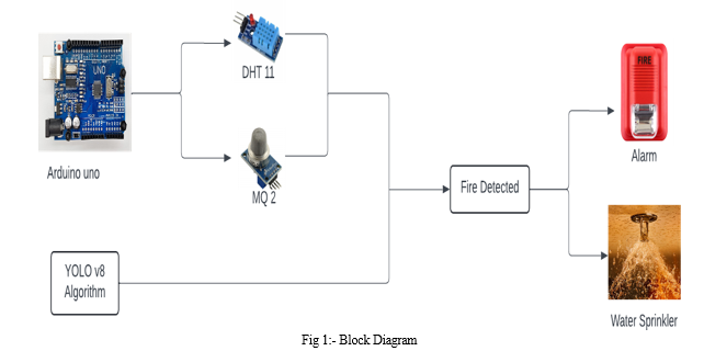 The proposed system's architecture involves a tiered approach. Smoke and thermal detectors are deployed throughout the protected area, continuously monitoring for smoke and temperature changes. Video surveillance cameras capture real-time footage of the environment, which is fed into the YOLO v8 object detection algorithm.