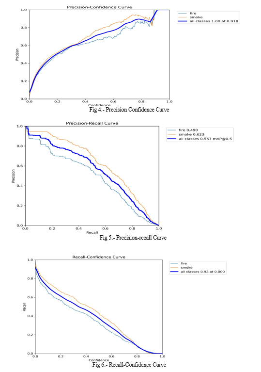 A YOLO v8 model was trained on a dataset that was annotated on Roboflow and trained on a personal system. The model was trained for 50 epochs with a batch size of 16 and an initial learning rate of 0.01. We implemented, trained, and validated the proposed model on Google Colab using a GPU platform. According to the experimental results, our model can detect fires with a precision of 95.7% and smoke with a precision of 99.3%, resulting in an overall mean average precision (mAP) of 97.5% for the two classes. Figure 3 shows the overall results of the proposed model, including loss, precision, and recall, while Figures 4 and 5 show the precision- recall curve. Additionally, Figure 6 presents the results of fire and smoke detection with the proposed model.