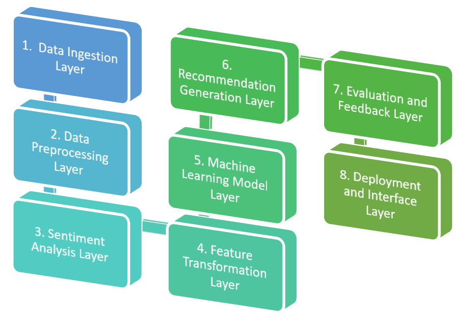 The recommendation layer applies ranking algorithms to prioritize movies based on sentiment scores, and filtering results to deliver only the most relevant recommendations.