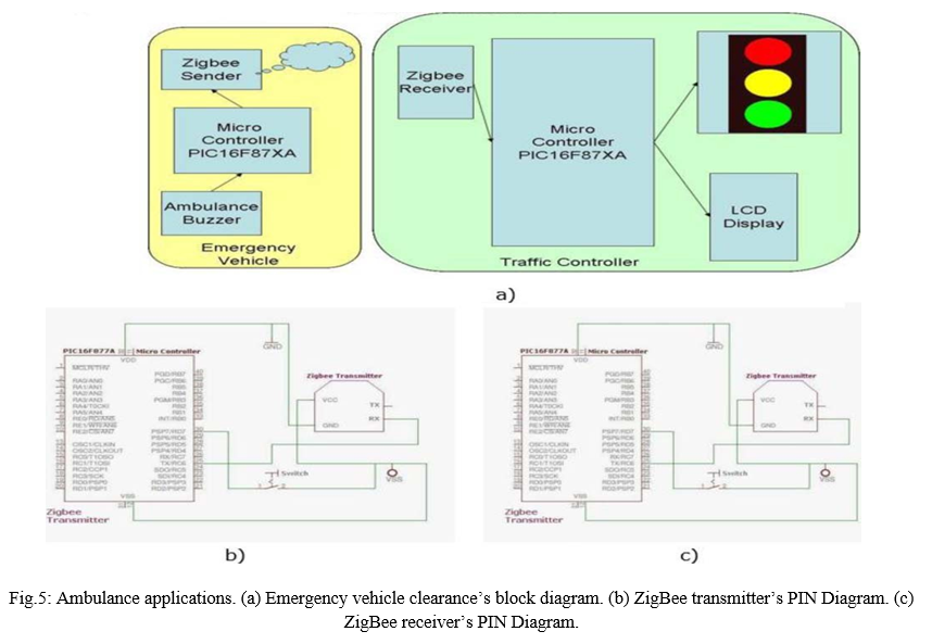 In this module, there are 2 parts, first part which is ZigBee transmitter is placed in the emergency vehicle. When the switch is pressed, it will transmit the signal. The signal contains unique id and security code. The transmitter contains PIC16F877A microcontroller and ZigBee module. The microcontroller sends the commands and data to the ZigBee via serial communication. Second part is the receiver, which is placed at traffic pole. It also contains PIC16F877A microcontroller and ZigBee module. The receiver compares the security code received to the security code present in its database. If it matches, then it will turn the green light on. For testing purpose, we used short range RFID reader in our prototype. First, the receiver part is turned on. The red and green signal will be on for 10 seconds duration and orange light will be on for 2 seconds duration one after the other. Secondly, we bring the RFID of stolen vehicle into the range of RFID reader. Then the signal will turn to red for duration of 30 seconds and a SMS is received. Thirdly, we bring 12 RFIDs into the range of RFID reader, and then the green light duration will change to 30 seconds. Fourthly, we bring an emergency vehicle carrying ZigBee transmitter into the range of ZigBee receiver, and then the traffic light will change to green till the receiver receives the ZigBee signal as shown in Fig 5.