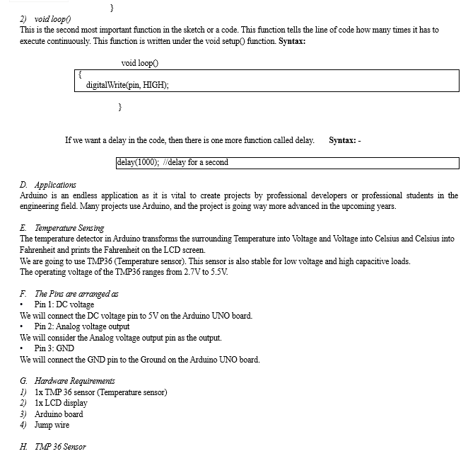 In this research paper, we have studied the basics of the Internet of Things (IoT), temperature sensors, Arduino board, and hardware/software requirements. We learned to develop or write sketches of Arduino in Arduino IDE for Temperature sensing. Arduino is an endless stream for IOT devices. A professional developer usually uses Arduino to create innovative things. Arduino is also known as a minicomputer that can control the process\'s input and output. The microcontroller of the Arduino is very intelligent, and it can be used in multiple programming languages. Arduino innovation can be done from wearable fashion to space satellite research programs. Arduino is a designed board that can be accessed from our setup or computer using a single USB cord. Arduino has no limitations and can be a learning platform for electronic students.