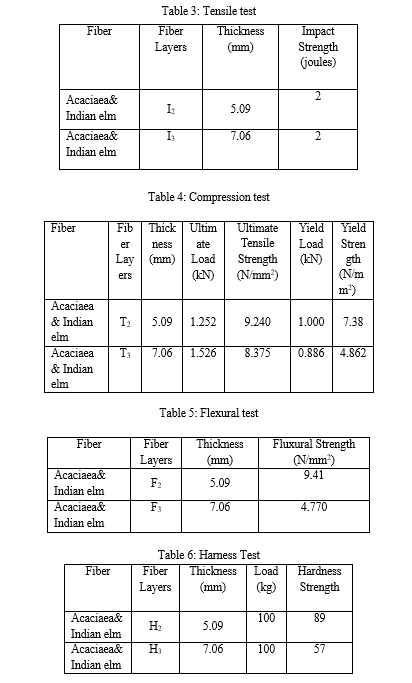 Successful fabrication of Acacia, Indian elm fiber with different weight fractions is possible by simple hand lay-up technique. The mechanical properties of the composites such as tensile strength, flexural strength and impact strength of the composites are also greatly influenced mostly by the fiber lengths and also its dimensions.