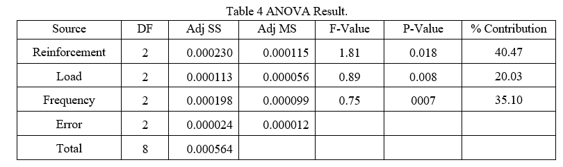 It shows table 4 that the Reinforcement (40.47%), the Load (20.03%) and the Frequency (35.10%) have major influence on the Wear Rate. Contribution of Frequency (40.47%) is highest among all three parameters hence it is most dominating parameter while Reinforcement is least affecting parameter.